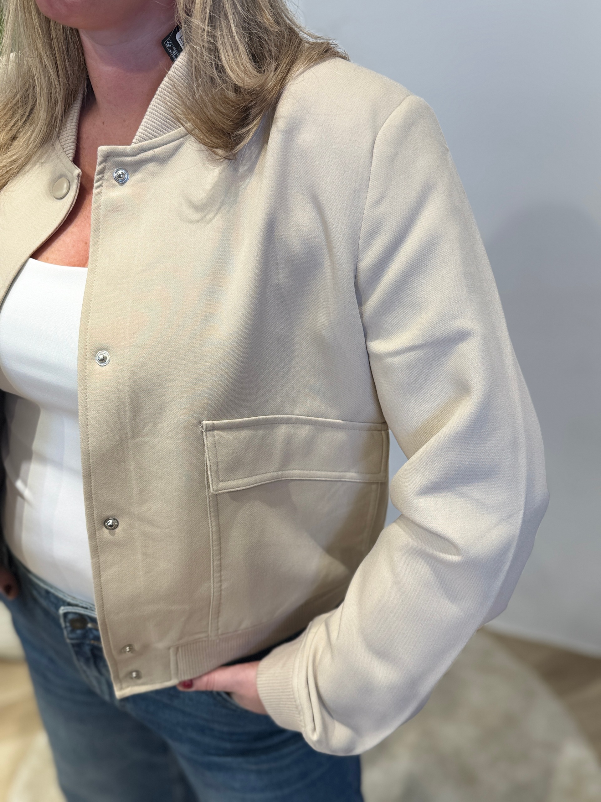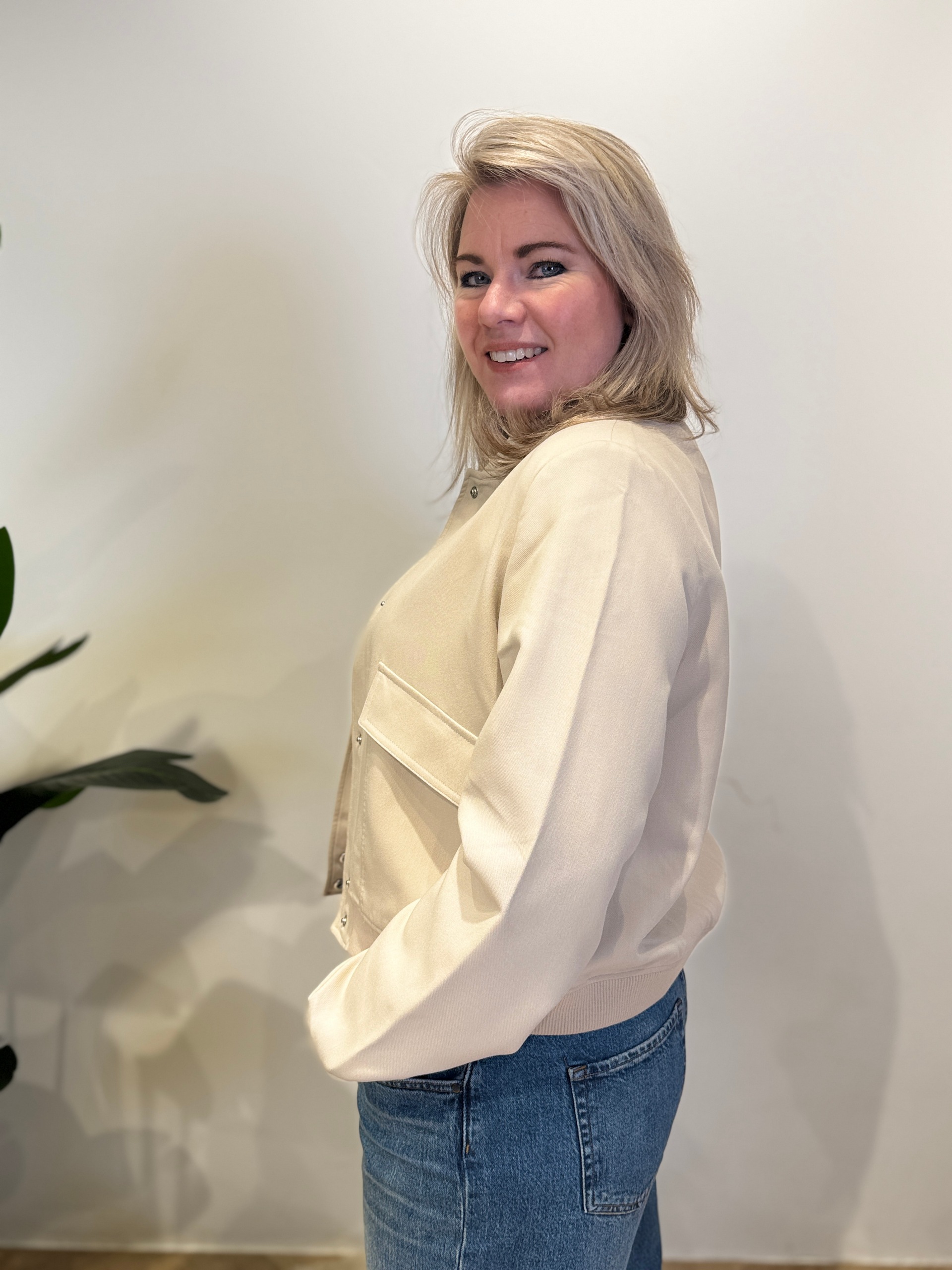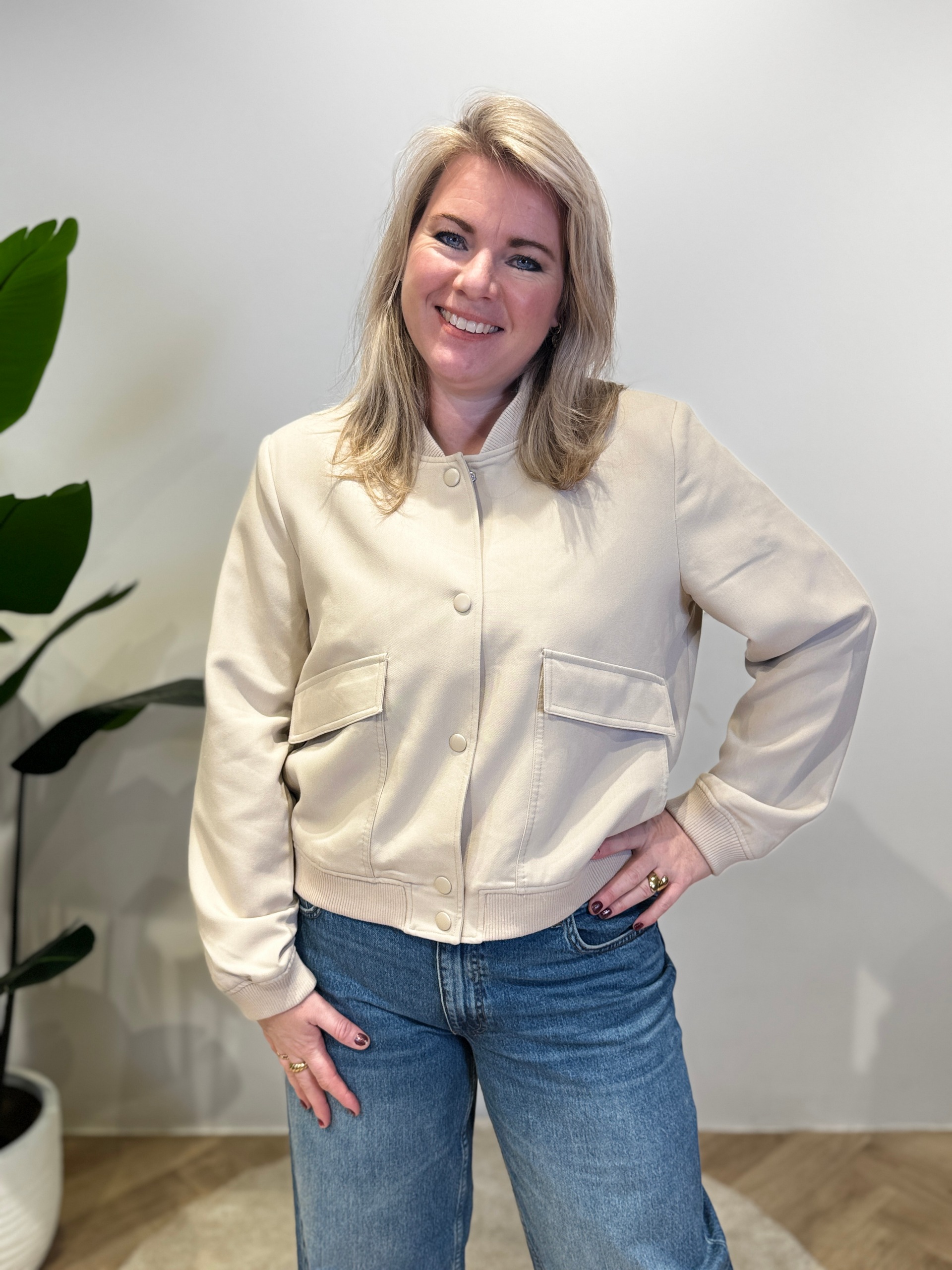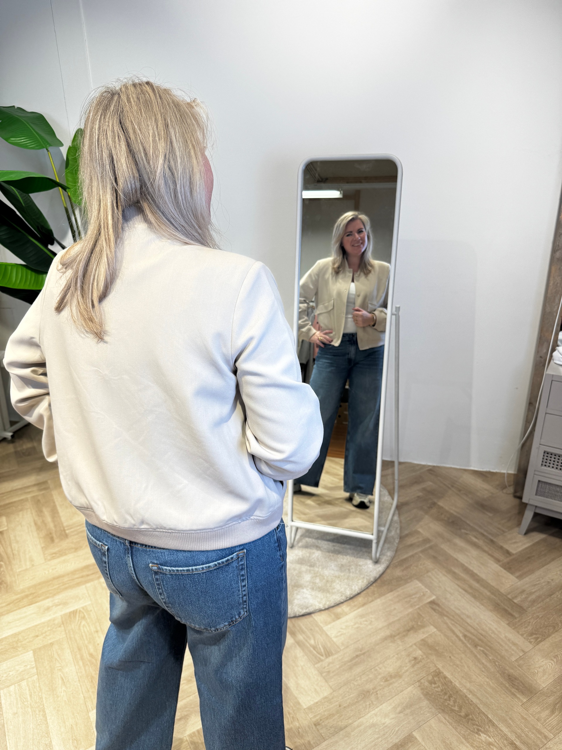 • Reinate draagt maat L van dit jasje