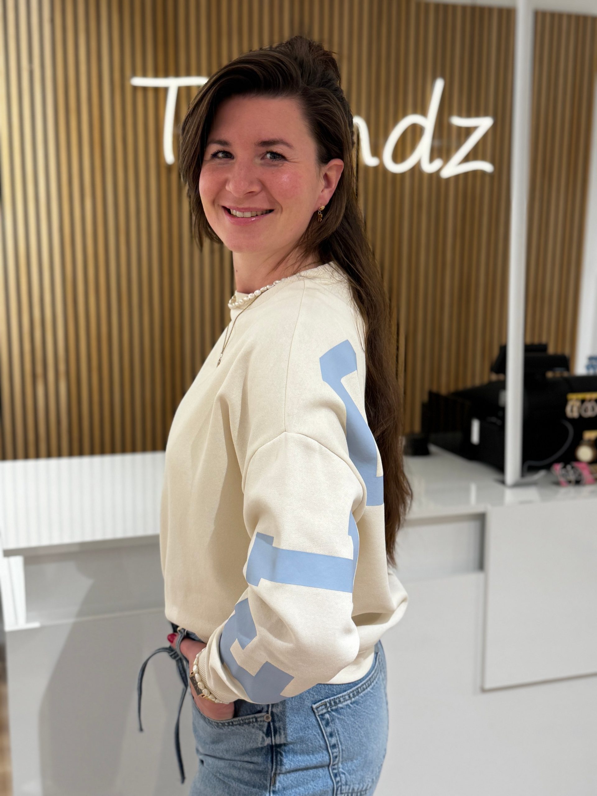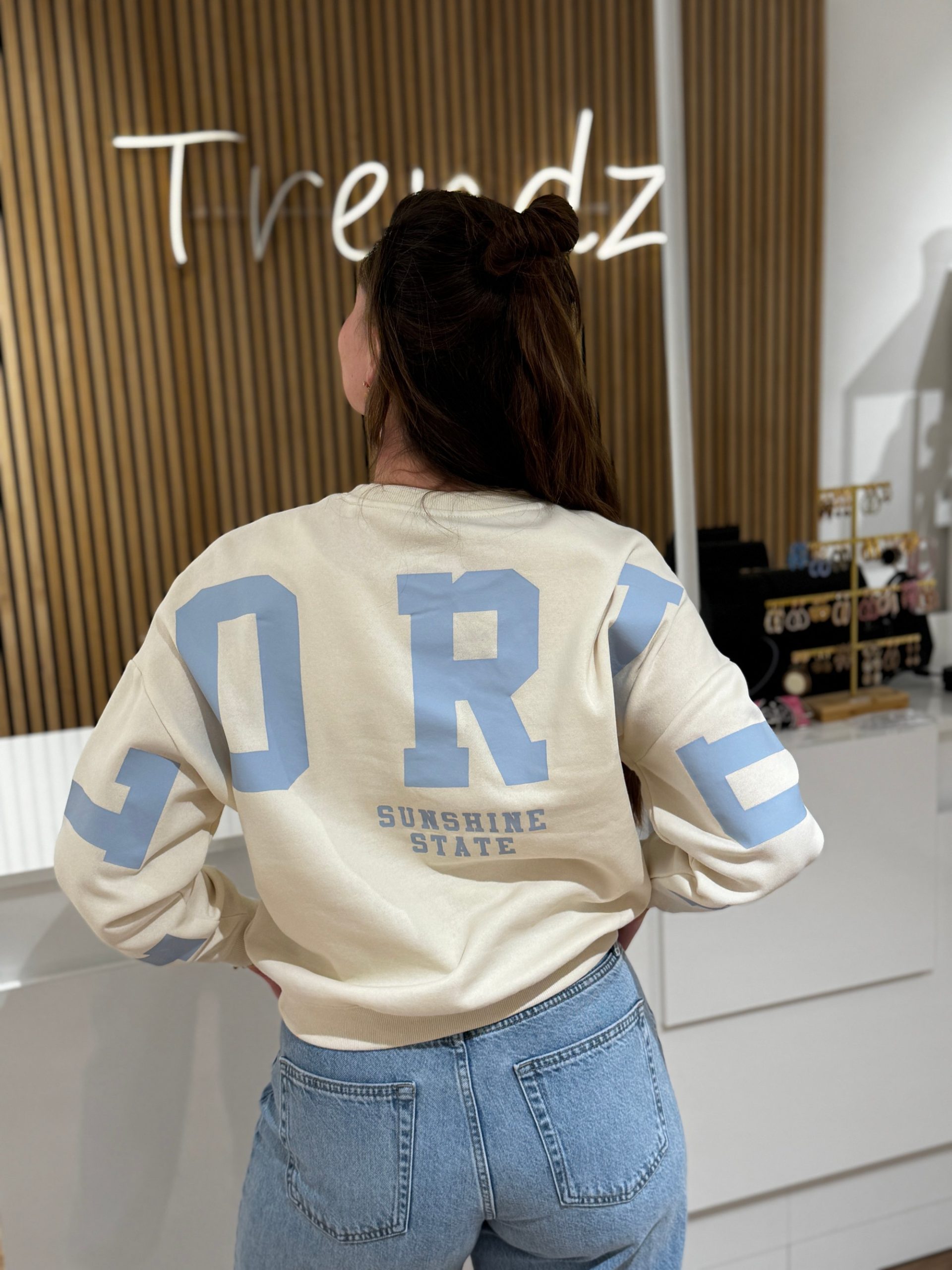 Sweater Florida off-white met lichtblauwe letters