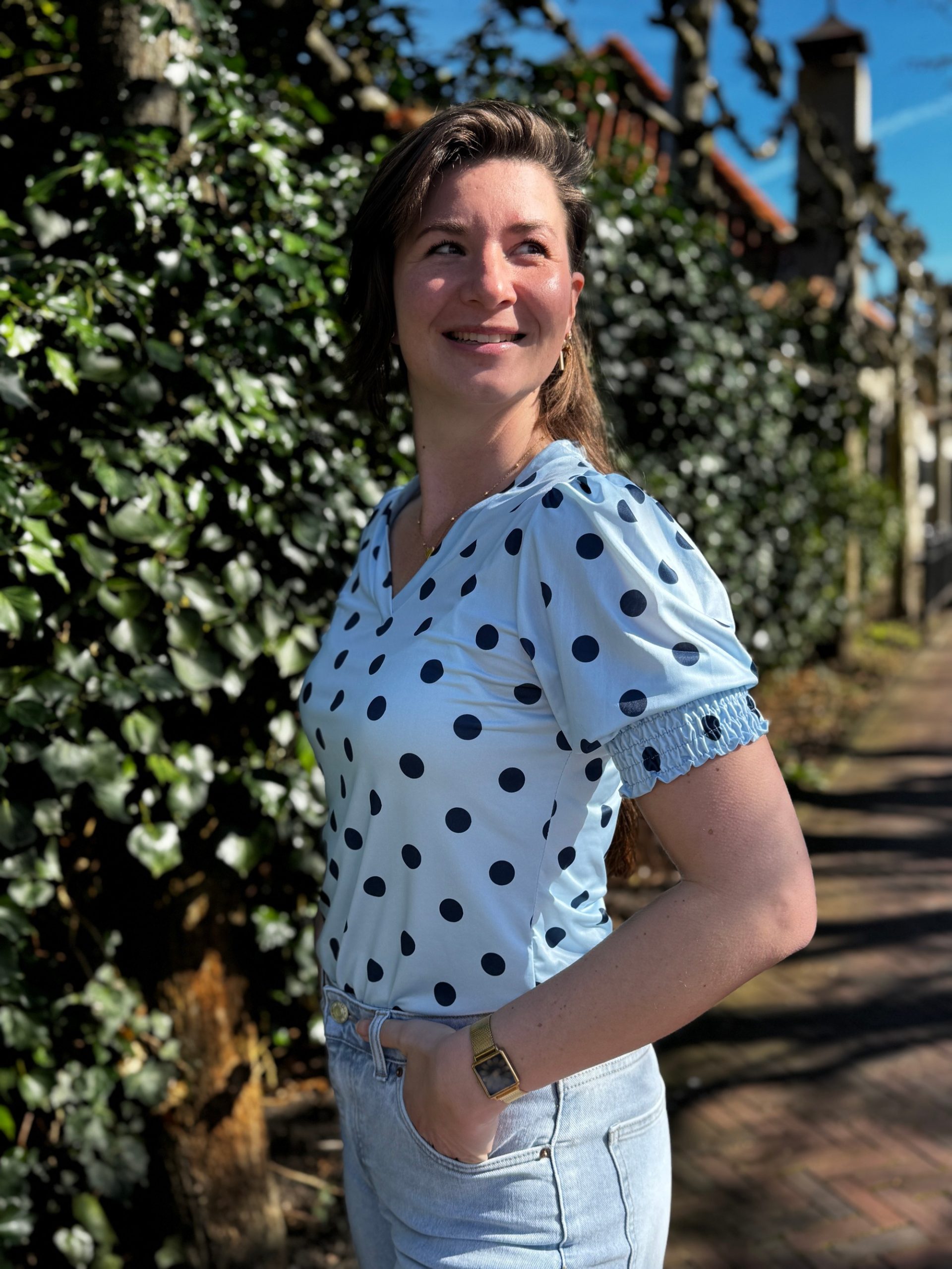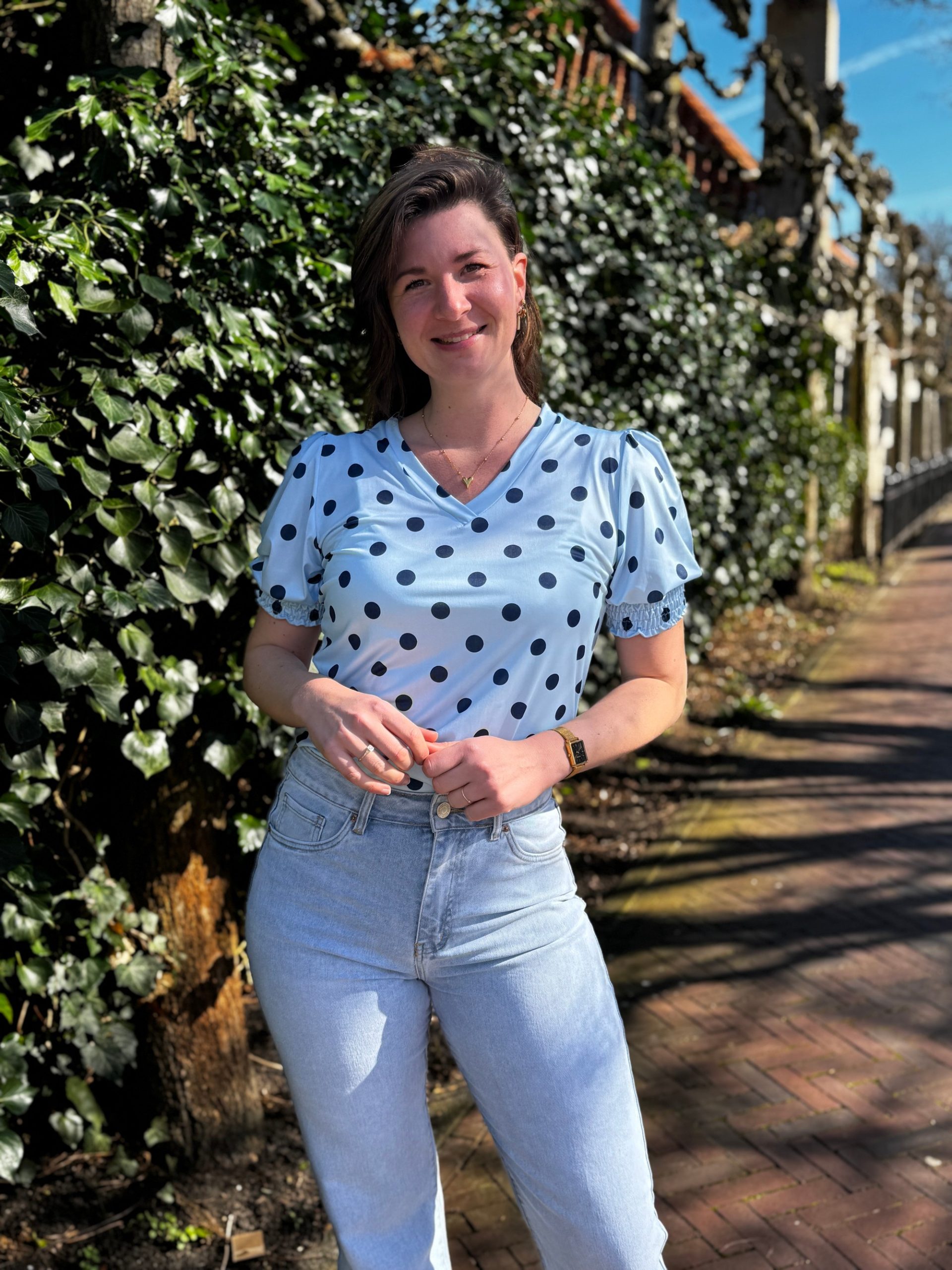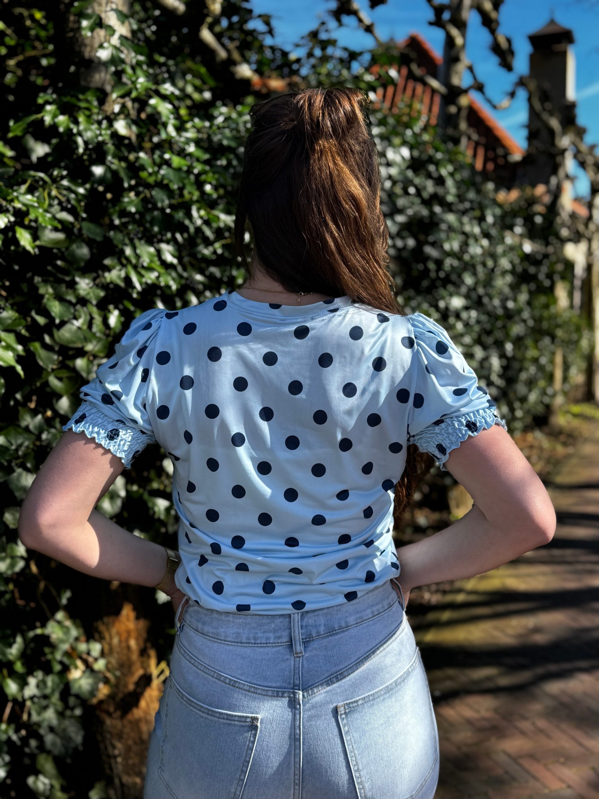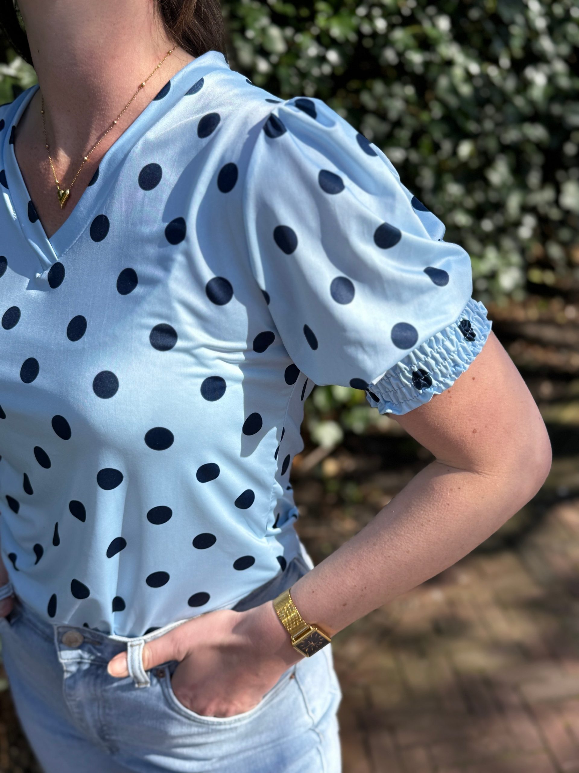 • Details: de stippen zijn donkerblauw, smok aan het uit einde van de mouwen en V-hals
